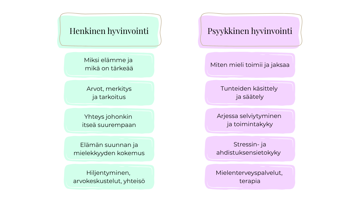 Psyykkinen ja henkinen hyvinvointi sekoitetaan usein toisiinsa, mutta ne ovat luonteeltaan erilaisia. Yksinkertaistaen: psyykkinen hyvinvointi liittyy siihen, miten mieli toimii, henkinen taas siihen, miksi elämme.